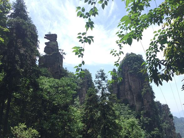 之后,在导游的引导下,我们来到了袁家界。顺着袁家界山顶向前,只见粗壮高大的石峰,枝繁叶茂的绿树,深不可测的沟壑,恰似一幅美伦美奂的水墨画凌空悬挂,好不壮观。来到电影《阿凡达》悬浮山“哈利路亚山”原型的乾坤柱前,只见乾坤柱气宇轩昂,挺拔威武,深不见底的屹立于群山之中,有一柱定乾坤之势。